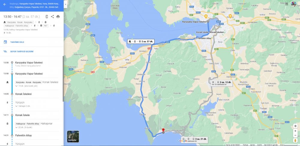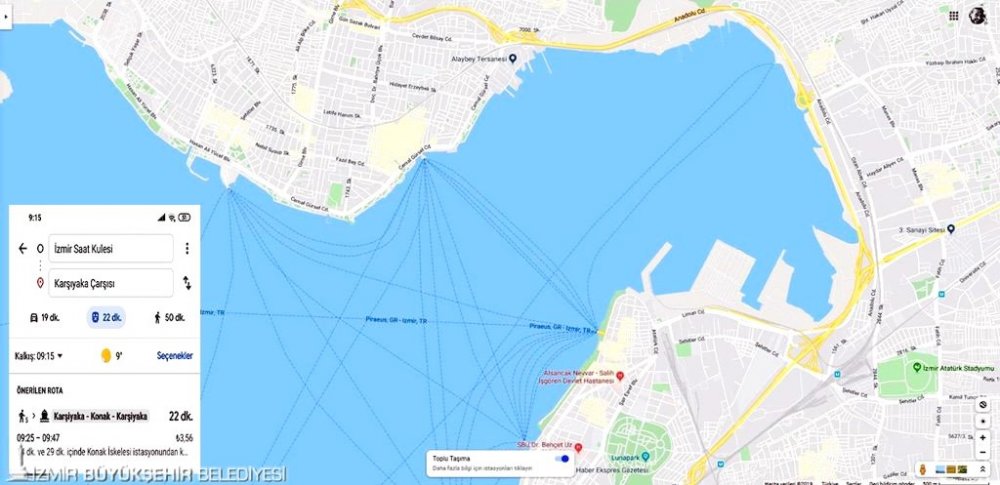 İzmir’de örneğin Karşıyaka’dan Adnan Menderes Havalimanı’na gitmek isteyen bir kişi, Google Haritalar’da toplu ulaşım seçeneğini seçtikten sonra Karşıyaka İskelesi’nin üzerine tıklayacak. Sefer saatlerini ve güzergâh bilgilerini gösteren ekran açılacak. Aynı hedefe otomobille yaklaşık bir buçuk saatte, vapur ve raylı sistem aktarmasıyla 50 dakikada gidilebildiğini gösteren veriler ekrana yansıyacak. ESHOT seferleri halen kurumun internet sayfası ve İZUM uygulamasından da takip edilebiliyor.
