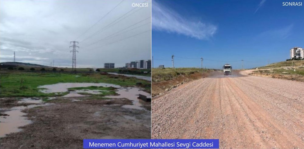 Eş zamanlı yürütülen bir diğer yol çalışması ise Menemen’de. İstiklal Mahallesi 5. Cadde ile 7440 Sokak arasında 25 metre genişliğinde 350 metre uzunluğunda ulaşım yolu açılıyor. Sevgi Caddesi'ndeki 20 metre genişliğinde 700 metre uzunluğundaki yol çalışmasının yüzde 85’i ise tamamlandı. Özellikle yeni yerleşim yerlerin