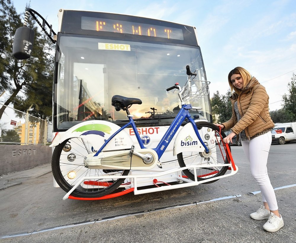 Kentte bisikletli ulaşımı teşvik etme stratejisi doğrultusunda, ESHOT’un yeni otobüslerinin tamamında, iki adet bisiklet taşıma aparatı fabrikasyon olarak bulunuyor. ESHOT atölyelerinde eski otobüslere de yapılan montaj çalışmaları sonucu, filonun yüzde 28’ine denk gelecek şekilde toplam 500 otobüs, bisikletli yolcuları da taşıyabiliyor. Ayrıca katlanır bisikletli ve elektrikli scooter sahibi yolcular da 06.00-09.00 ve 16.00-20.00 saatleri haricinde tüm otobüslere araçlarıyla birlikte biniş yapabiliyor.