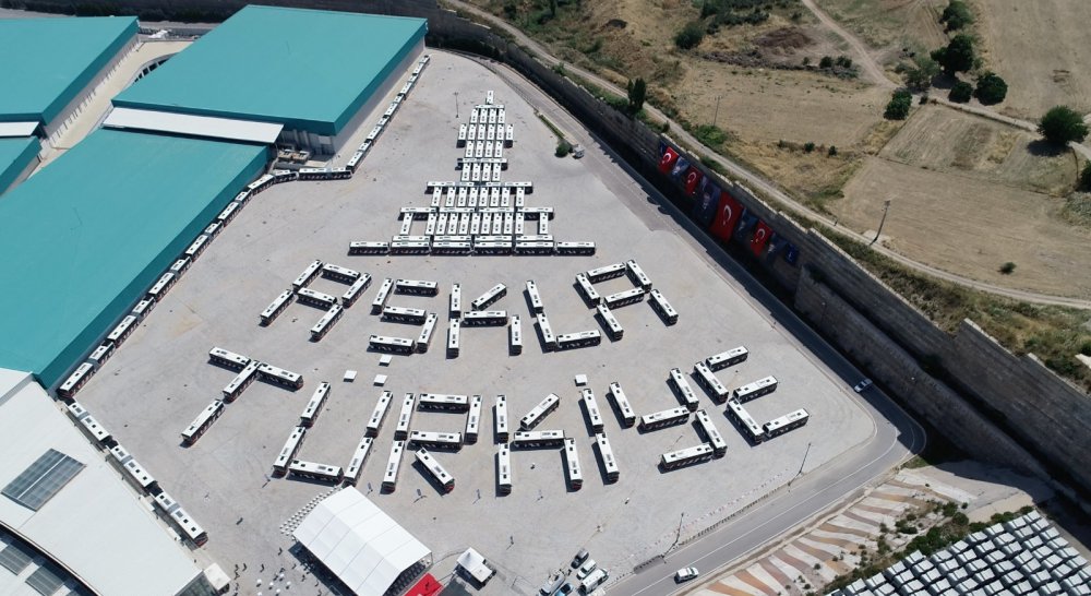 Fuar İzmir’deki tarihi törende, araçların bir bölümüyle İzmir’in simgesi Saat Kulesi figürü oluşturuldu ve altına da yine Otokar otobüslerle “Aşkla Türkiye” yazıldı.