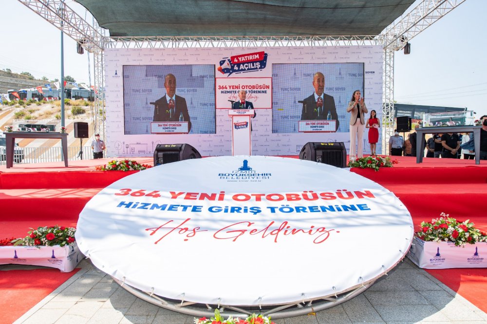 İzmir Büyükşehir Belediye Başkanı Tunç Soyer ise sözlerine “Görev süremizin ikinci yılında, yoğun bir mücadelenin sonucunda Türkiye’de tek seferde en büyük otobüs alımını gerçekleştirerek İzmir’e 364 otobüs kazandırdık. İki yıllık görev süremizde, filomuza daha önce kattığımız 83 otobüs ve Türkiye’de ilk kez engelli vatandaşlarımıza özel hizmet verecek 4 otobüsümüz ile birlikte 451 yepyeni aracı İzmir halkının hizmetine sunduk” diyerek başladı. Soyer, “451! Bu rakam İzmirlileri her gün evinden işine taşıyan, sevdikleriyle buluşturan tüm otobüs filosunun üçte birine tekabül ediyor. Sadece iki yılda İzmir’in devasa otobüs filosunun üçte birini yenileyerek halkımızın hizmetine sunduk” diye konuştu.