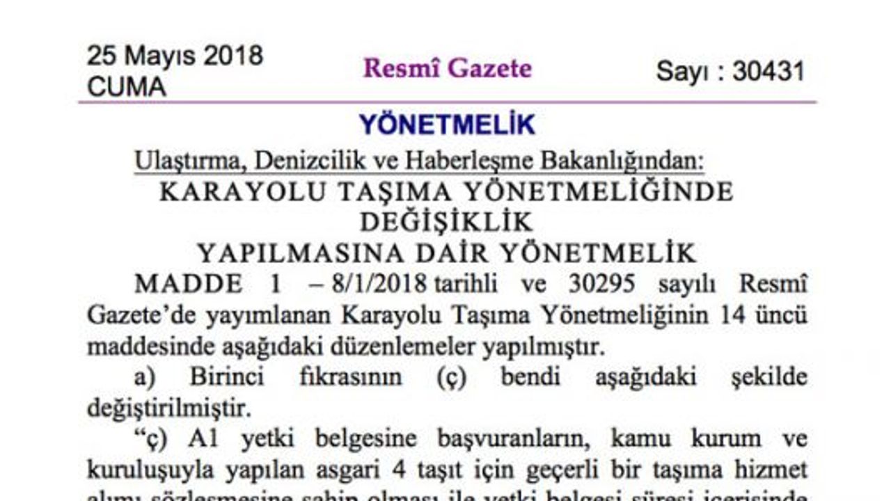 Karayolu Tasima Yonetmeligi Duzenlemesi - 25 Mayıs 2018 Resmi Gazetede Yayınlandı
