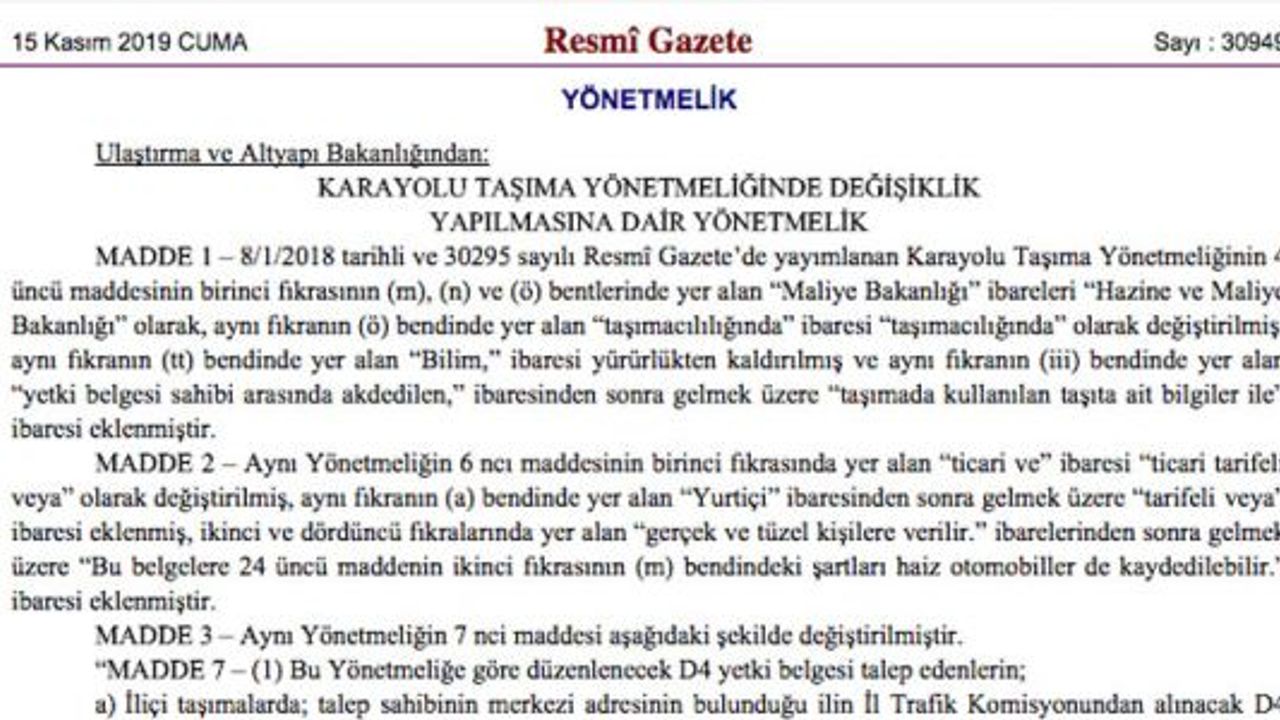 Ulaştırma ve Altyapı Bakanlığı Karayolu Taşıma Yönetmeliği’nin 27 maddesinde değişiklik yaptı. Yönetmelik değişikliği 15 Kasım 2019 tarih ve 30949 sayılı Resmi Gazete de yayımlandı.