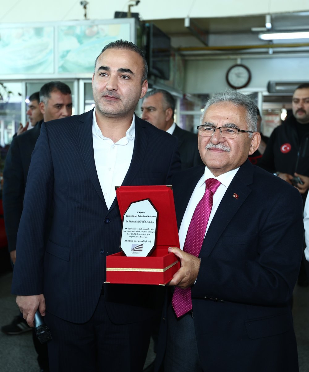 Kayseri Otogar Müdürü Fatih Ulusoy ise geçen seneden beri elinden geldiği kadar otogarda hizmet etmeye çalıştığını dile getirdi. Ulusoy konuşmasında, “En büyük destekçim Kayseri Büyükşehir Belediyesi’nin kıymetli bürokratları, genel sekreteri başkanımızın sayesinde. Başkanım, bu zamana kadar ne gerekiyorsa tüm destekleri verdiğiniz için tüm firma çalışanlarının huzurunda teşekkür etmeyi size borç biliyorum” diyerek Başkan Büyükkılıç’a plaket takdiminde bulundu.