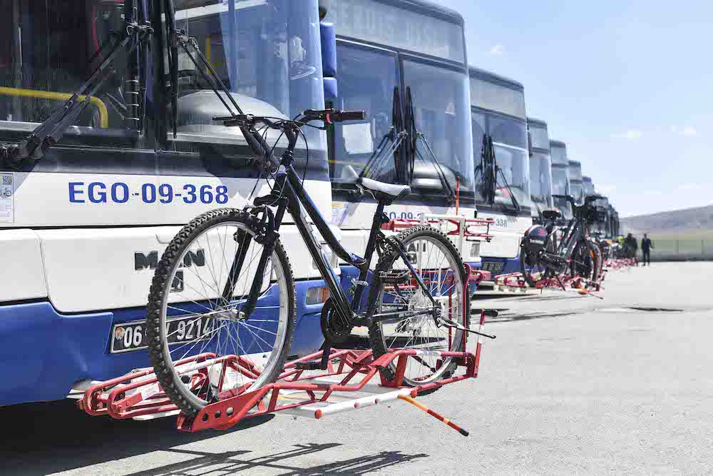 “EGO Genel Müdürlüğü olarak Ankara’da sürdürülebilir ulaşımın mümkün kılınarak uzun vadeli bir vizyon ve stratejiye dayanan bir ulaşım planının oluşturulabilmesi ve şehrin diğer ulaşım modlarına da entegrasyonunu sağlayabilmek için çalışmalarımıza devam ediyoruz. Smart Ankara için Ekipman Temini Projesi 15.08.2022 tarihine başlatılmış olup sözleşme kapsamında 480 adet otobüse bisiklet taşıma aparatı imalatı ve montajının yapılması yer alıyor. Bu kapsamda filomuzda bulunan 480 adet otobüsümüzün ön kısmına çift taşıyıcılı bisiklet taşıma aparatı montajı yaparak vatandaşımızın kullanımına sunduk. Şahsi bisikletleriyle yolculuk yapmak isteyen vatandaşlarımız kullanım talimatı doğrultusunda bisikletini aparata yerleştirdikten sonra yolculuğuna devam edebilecek.”