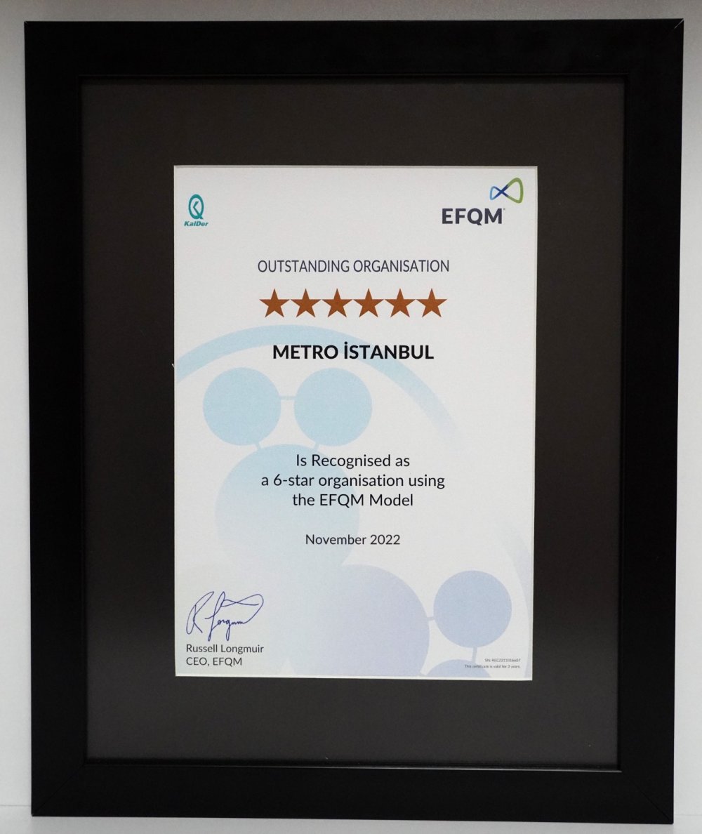 Türkiye’nin önde gelen kurum ve kuruluşlarının yer aldığı 31. Kalite Kongresi, 22-23 Kasım 2022 tarihlerinde Kocaeli Kongre Merkezi’nde gerçekleştirildi. Ödüllerin titiz değerlendirmeler sonucu sahiplerini bulduğu kongrede, KalDeR tarafından Türkiye Mükemmellik Ödülü’ne Metro İstanbul layık görüldü. KalDeR’in, Avrupa Kalite Yönetim Vakfı (EFQM) Mükemmellik Modeli doğrultusunda yaptığı yetkinlik değerlendirmesinde, Metro İstanbul’un toplumsal cinsiyet eşitliği, çeşitlilik ve kapsayıcılık iyi uygulamaları tam not aldı. 6 yıldız alarak Türkiye Mükemmellik Ödülü’nün sahibi olan Metro İstanbul, dünyada 6 yıldız alan ilk ve tek raylı sistem işletmecisi oldu.