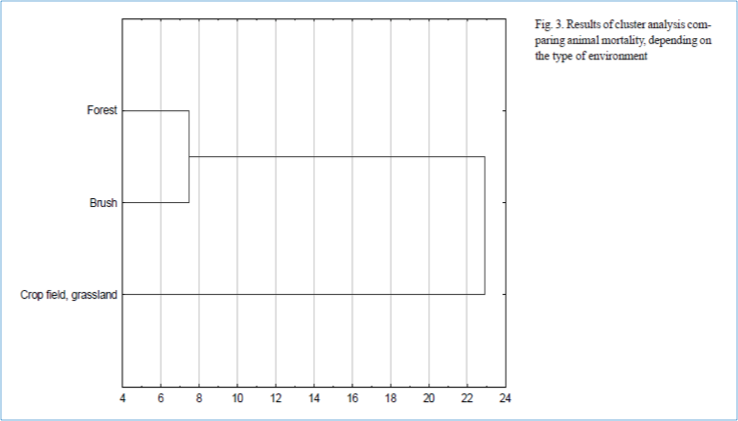 Şekil 4 çayır alanlarda neden hayvan-tren taşıtı kazalarının yoğun yaşandığını daha açık göstermektedir fakat, Kruskal-Wallis ANOVA ise çarpışmanın gerçekleştiği noktada yersel farklılıklara önemli derecede bir istatistiksel farklılık olmadığını göstermektedir ve her bir bölgedeki ilgili farklı ölçeklerin hesaba alınmadığı da gerçektir.