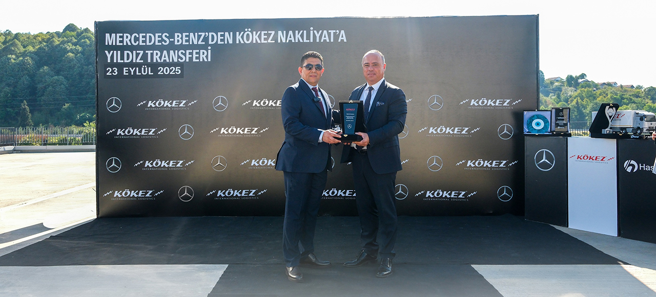 Mercedes-Benz Türk Kamyon Satış ve Pazarlama Müdürü Alper Kurt, Kökez Nakliyat Yönetim Kurulu Başkanı Yılmaz Bakırcı’ya bir plaket sundu.