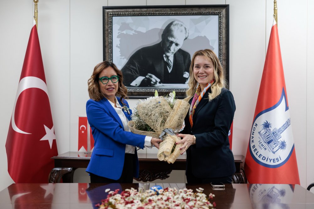 Konak Belediye Başkanı Nilüfer Çınarlı Başkan Mutlu, Gündoğdu’daki tören öncesinde UNDP Türkiye Mukim Temsilcisi Monica Merino ve beraberindeki heyeti makamında konuk etti. Sıfır atık ve istihdam alanında hayata geçirilen iş birliklerinin masaya yatırıldığı ziyarette, kasım ayında göreve başlayan UNDP Türkiye Mukim Temsilcisi Monica Merino’ya başarılar dileyerek sözlerine başlayan Başkan Mutlu, “Sizlerle iş birliği yapmaktan çok mutluyuz. Yeni projelerde de birlikte olacağımızı düşünüyoruz. Karşılıklı olarak birbirimizden besleneceğiz. Bu projeyi çok önemsiyoruz. Atıkların ayrıştırılmasının biran önce başlaması bizim için önemli. Şu an şehirde bu ayrıştırmayı kendi yapan toplayıcı grupların yarattığı bir düzensizlik var. Onları da bu sistem içine alacağımız için çok yararlı bir proje olacak” dedi.