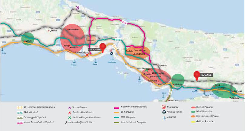 İstanbul ve Kocaeli illerini kapsayan Marmara Bölgesi Türkiye’nin en önemli lojistik pazarı olarak öne çıkıyor. İstanbul Avrupa yakasında Hadımköy ve Esenyurt, Asya yakasında Tuzla, Kocaeli’de ise Gebze, Çayırova ile Dilovası Marmara Bölgesi’nin başlıca lojistik alt pazarı konumunda.