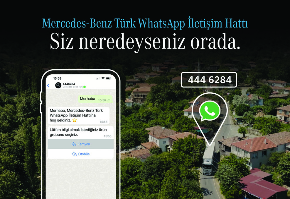 Mercedes-Benz Türk, 444 62 84 numaralı çağrı merkezine ait WhatsApp İletişim hattını devreye aldı. Üstün performans ve kaliteli hizmet anlayışıyla müşteri memnuniyetini her zaman en üst seviyede tutmayı amaçlayan Mercedes-Benz Türk, WhatsApp İletişim hattını hayata geçirdi. Mercedes-Benz yıldızlı kamyon & otobüs sahip ve soförleri, satış, satış sonrası ve ikinci el süreçlerine dair tüm sorularına, yapay zekâ kullanımının arttığı bu dönemde chatbot (sohbet robotu) üzerinden yanıt bulabilecek.