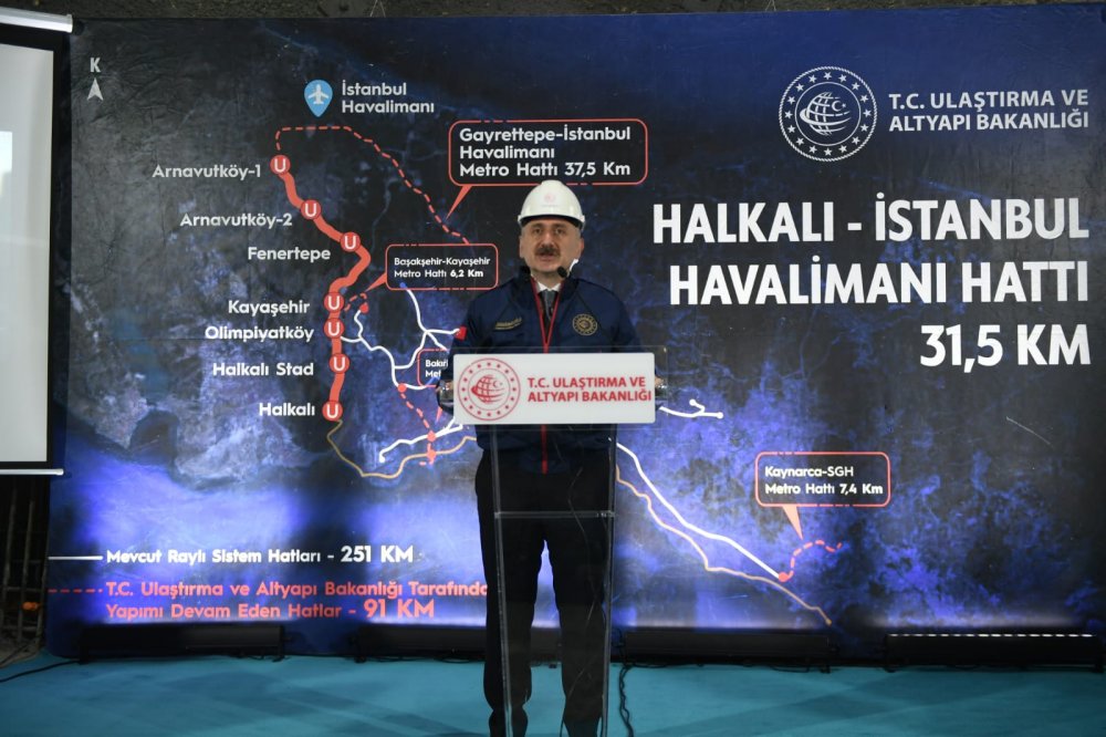 Halkalı-İstanbul Havalimanı Metrosu 2TBM'nin kazıya başlaması töreninde konuşan Bakan Karaismailoğlu; en önemli projelerden olan Küçükçekmece-Halkalı-Kayaşehir-Başakşehir-Arnavutköy-Havalimanı Metro hattının; Olimpiyatköy-Halkalı kesimi tüneline bugün ilk kazmayı vurduklarını kaydetti. Karaismailoğlu, “Başlayacağımız kazı çalışmalarında, toplam 12 bin 830 metre ilerleyerek, bu yılın sonunda Halkalı İstasyonu’muza ulaşmayı planlıyoruz. Marmaray Halkalı İstasyonu ile başlayan 31,5 kilometrelik bu hatta; Marmaray, K.Çekmece Halkalı, Olimpiyatköy, Kayaşehir, Fenertepe, Avnavutköy-2, Arnavutköy-1 ve Havalimanı istasyonları yer alıyor. Halkalı-Havalimanı Hattımız; Halkalı İstasyonundan Marmaray Banliyo hattına, Havaalanından da Havalimanı-Kağıthane Gayrettepe hattına bağlanacaktır. İstanbul Havalimanı ile kentin merkezi lokasyonları arasındaki ulaşımın süresini, 30 dakikanın altına indirmeyi amaçlıyoruz” diye konuştu.