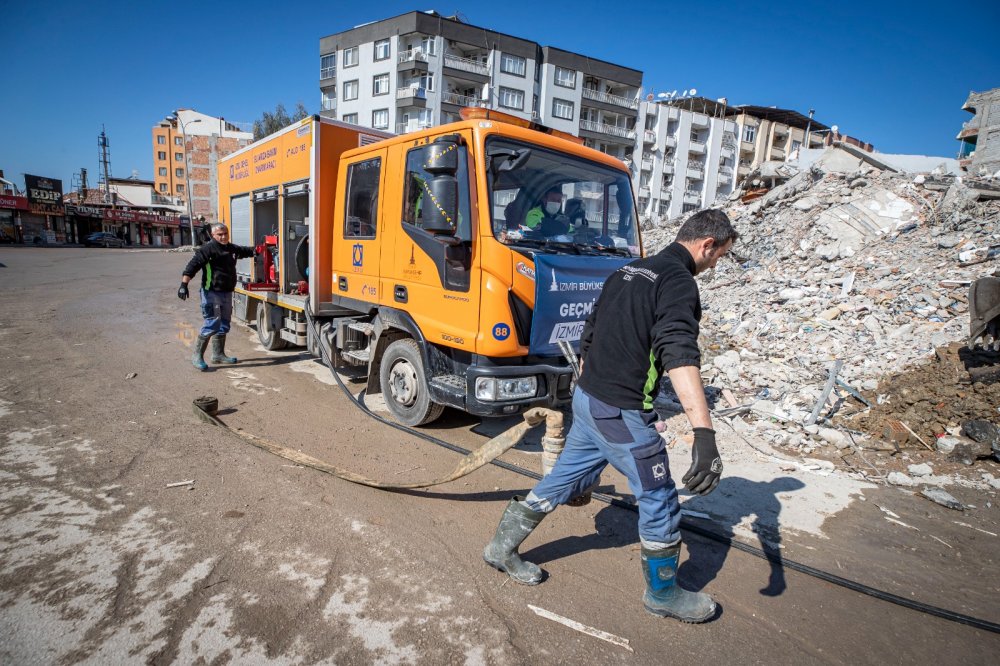 Türkiye’yi yasa boğan ve 6 Şubat depreminin ardından afet bölgesine destek veren kurumlardan İzmir Büyükşehir Belediyesi İZSU Genel Müdürlüğü, yıkımın en ağır yaşandığı Hatay’da çalışmalarına devam ediyor. İlk günlerde arama kurtarma çalışmalarına da katılan İZSU ekipleri, 203 personel, iş makinesi, su tankerleri, kanal temizleme araçları, vidanjörlerden oluşan 72 iş makinesiyle Hatay ve ilçelerinde görev yapıyor.