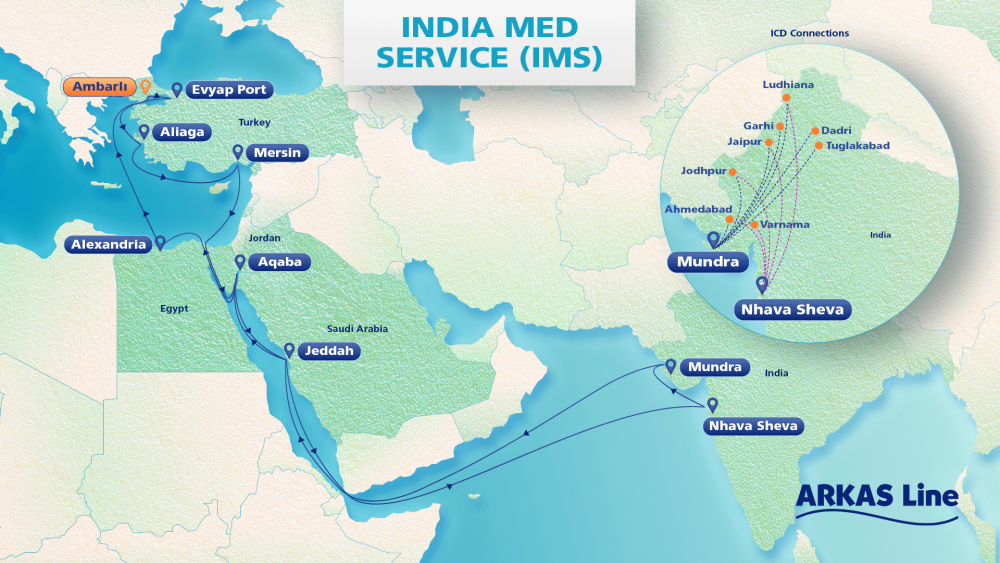 2.500- 2.800 TEU kapasiteli dört gemi ile 11 Şubat 2025’te başlayacak olan Hindistan servisi, Haziran 2025 itibariyle 5 gemiye çıkacak ve haftalık olarak hizmet vermeye devam edecek. “India Med Service (IMS)” rotası Ambarlı- Evyap – Aliağa – Mersin – Aqaba – Jeddah – NhavaSheva – Mundra – Jeddah – Aqaba – Alexandria – Ambarlı şeklinde olacak.