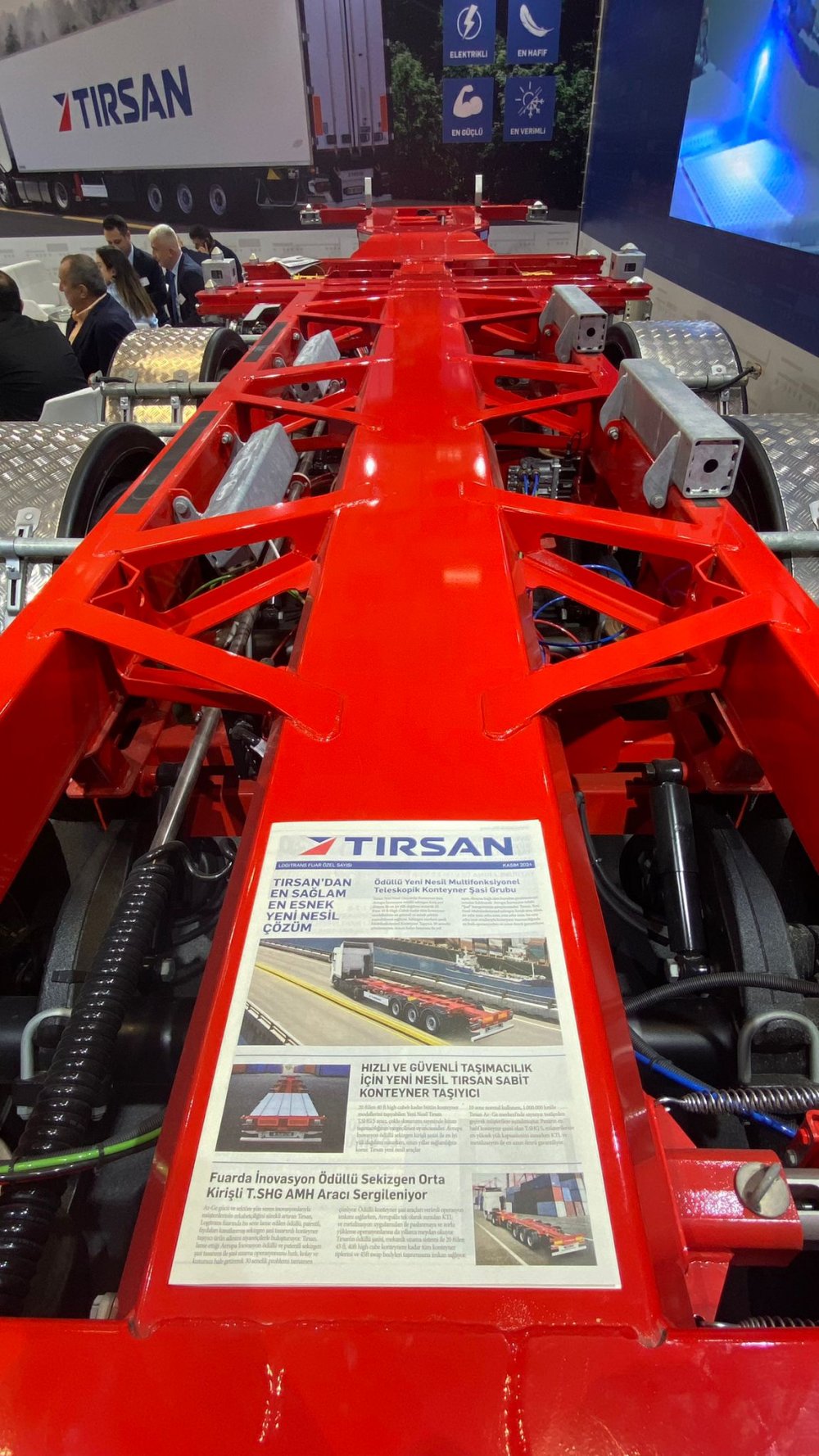 Tırsan, fuarda Avrupa İnovasyon Ödüllü sekizgen kirişli T.SHG AMH konteyner taşıyıcı aracını sergileyerek, dayanıklılığı ve operasyonel verimliliği bir araya getiren patentli sekizgen kirişli şasi tasarımını ziyaretçilere tanıttı. Bu yenilikçi tasarım, konteyner taşımacılığında 30 yıllık sıkışma ve burulma problemlerini tamamen ortadan kaldırarak, hızlı ve güvenli operasyon imkanı sunuyor. Avrupa’da tek olarak sunulan aynı anda KTL ve metalizasyon uygulamaları ile paslanmaya ve zorlu yükleme operasyonlarına yıllarca meydan okuyor. Tırsan’ın ödüllü şasisi, mekanik uzama sistemi ile 20 ft’den 45 ft, 40ft high cube konteynere kadar tüm konteyner tiplerini ve 45ft swap bodyleri taşınmasına imkan sağlıyor.