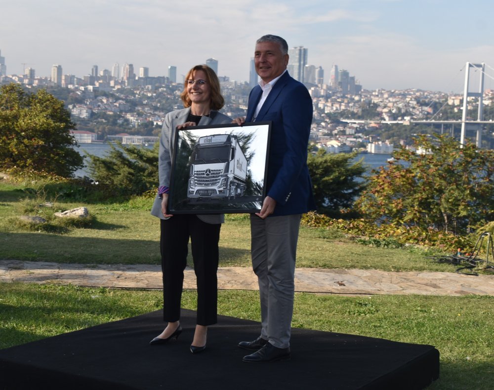 Mercedes-Benz Türk İcra Kurulu Başkanı Süer Sülün, Ekol Lojistik Türkiye Ülke Müdürü Arzu Ekiz’e hediyesini sundu.