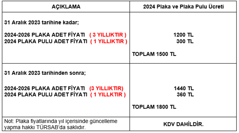 TÜRSAB 29 Kasım 2023 tarihinde; seyahat acentaları birliği yönetmeliğin 40. ve 41. maddelerine istinaden 2024 yılı paket tur ve transfer araçlarında bulunması gereken TÜRSAB araç plakası ile ilgili ilgili bir duyuru yayınladı. Bu duyuru’ da 2024 yılında kullanılacak olan plaka başvurularının 1 Aralık 2023 tarihinde başlayacağını ve uygulanacak plaka ücretlerini ise aşağıda tabloda acentaların bilgilerine sundu.