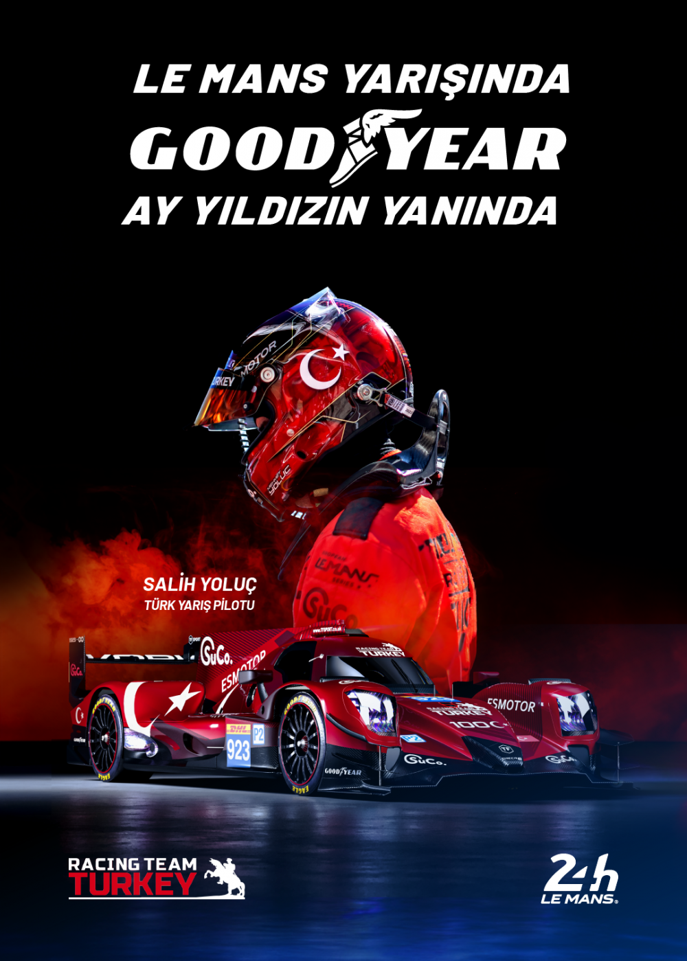 Efsanevi Le Mans 24 saat yarışlarında ilk kez bir Türk takımı start alıyor. Cumhuriyetimizin ve Le Mans’ın 100. yılı olması nedeniyle daha da anlamlı olan yarışta Goodyear lastikleriyle yarışacak olan Racing Team Turkey, 8’i Pro/Am olmak üzere, 24 aracın start alacağı LMP2 ve LMP2 Pro/Am kategorilerinde şampiyonluğu hedefliyor. Geçtiğimiz yıl Avrupa Le Mans Serisi Pro/Am 2022’de şampiyon olarak bir dayanıklılık serisinde bu başarıyı elde eden ilk Türk takımı olan Racing Team Turkey, Le Mans 24 2023’te de şampiyon olarak tarihe geçmeyi amaçlıyor. Cumhuriyetimizin 100. yılına özel olarak tasarlanan 923 kapı numaralı araçlarıyla Goodyear sponsorluğunda ve Salih Yoluç’un liderliğinde yarışacak olan takımda İngiliz pilot Tom Gamble ve Belçikalı pilot Dries Vanthoor da yer alıyor.