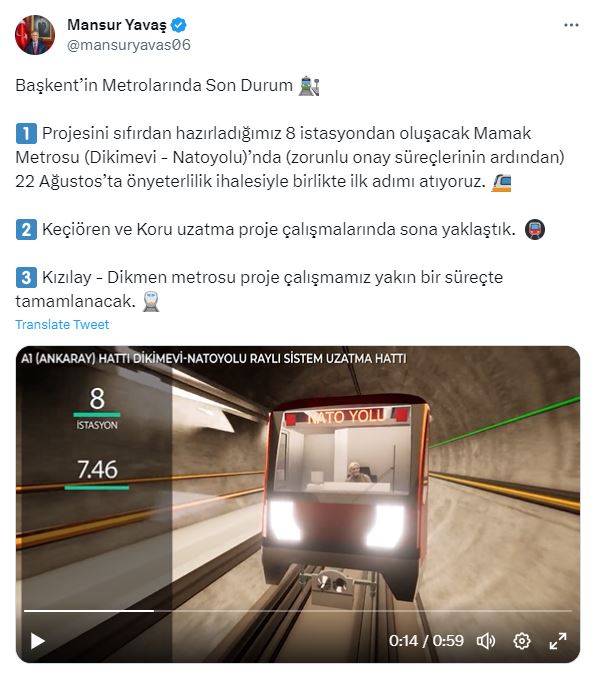 “Başkent metrolarında son durum” başlığıyla sosyal medya hesaplarından videolu paylaşımda bulunan Ankara Büyükşehir Belediye Başkanı Mansur Yavaş, şu ifadeleri kullandı. “Başkent’in Metrolarında Son Durum… Projesini sıfırdan hazırladığımız 8 istasyondan oluşacak Mamak Metrosu’nda (Dikimevi-Natoyolu) (zorunlu onay süreçlerinin ardından) 22 Ağustos’ta önyeterlilik ihalesiyle birlikte ilk adımı atıyoruz. Keçiören ve Koru uzatma proje çalışmalarında sona yaklaştık. Kızılay-Dikmen metrosu proje çalışmamız yakın bir süreçte tamamlanacak.”
