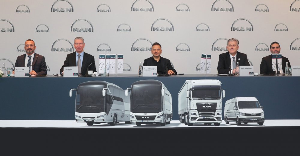 MAN Kamyon ve Otobüs Ticaret A.Ş. Yıllık Değerlendirme Toplantısı'nda Kamyon Satış Direktörü Serkan Sara, Otobüs Satış Direktörü Can Cansu, İkinci El Satış Direktörü Aydın Yumrukçal, Müşteri Hizmetleri Direktörü Şinasi Ekincioğlu, Hafif Ticari Araç Ülke Satış Müdürü Cumhur Kutlubay basını bilgilendirdi.