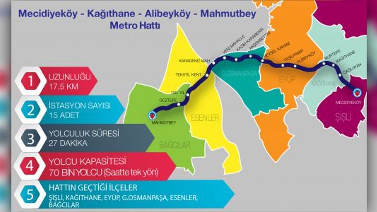 Mecidiyeköy-Mahmutbey metrosunun tünel kazı çalışmalarının %80'i tamamlandı. Kazıların 2016 yılı sonunda bitirilerek, elektromekanik çalışmalarının başlaması planlanıyor. Bu hatta bağlanacak olan Kabataş-Mecidiyeköy metro inşaatı da tüm hızıyla devam ediyor. Mecidiyeköy-Mahmutbey metro hattının uzunluğu 17 km, istasyon sayısı 15. Saatte tek yönde 70 bin yolcu taşınacak.
