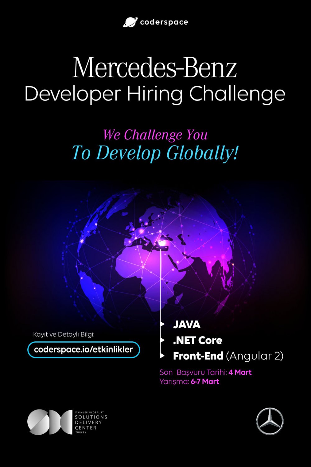 Mercedes-Benz’in ana şirketi Daimler AG’nin, 2013 yılında küresel IT stratejisi kapsamında Türkiye’yi bilgi teknolojileri üslerinden biri olarak konumlandırmasının ardından açılan Küresel IT Çözümleri Merkezi, yeni çalışma arkadaşlarına ulaşabilmek adına “Mercedes-Benz Developer Hiring Challenge” isimli bir yarışma düzenliyor. 6-7 Mart tarihlerinde, CoderSpace iş birliği ile düzenlenecek olan Mercedes-Benz Developer Hiring Challenge’da başarılı olan adaylar, 2021 yılında Küresel IT Çözümleri Merkezi çatısı altında Daimler Mobility AG tarafından kurulan Daimler Mobility Global Tech-Hub ekibine katılmak üzere mülakata davet edilecek.