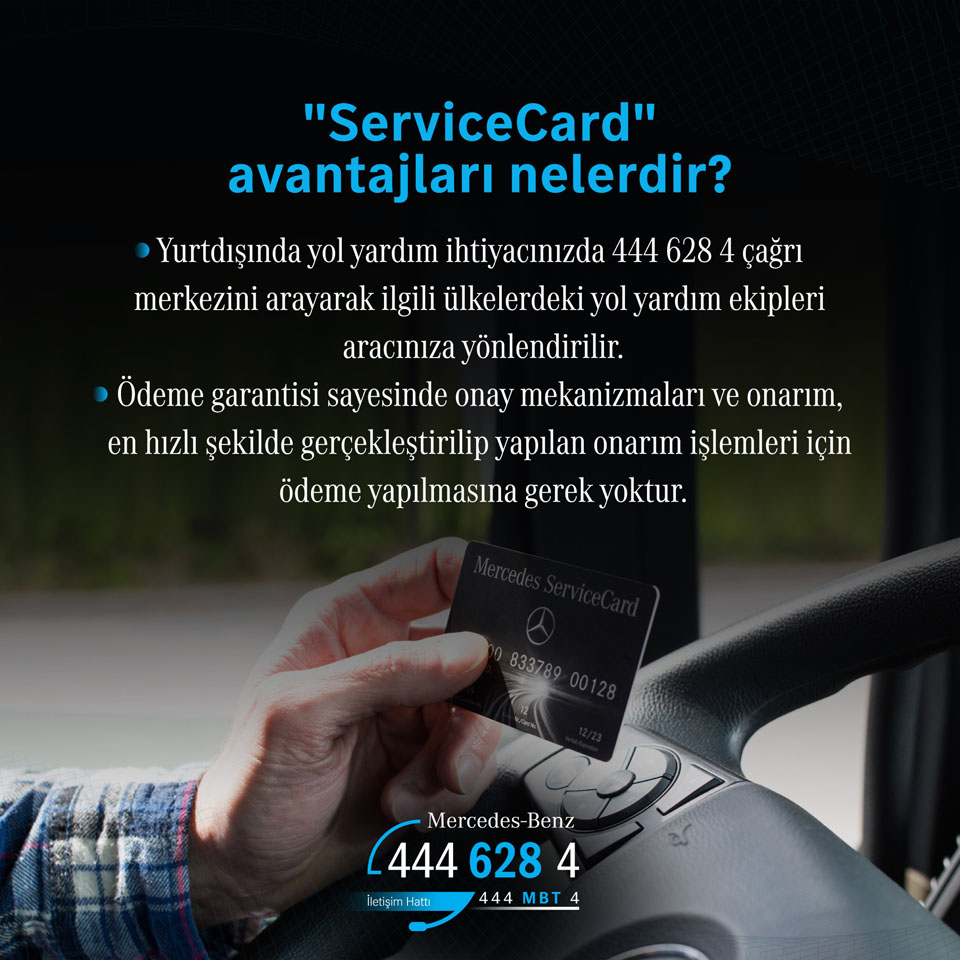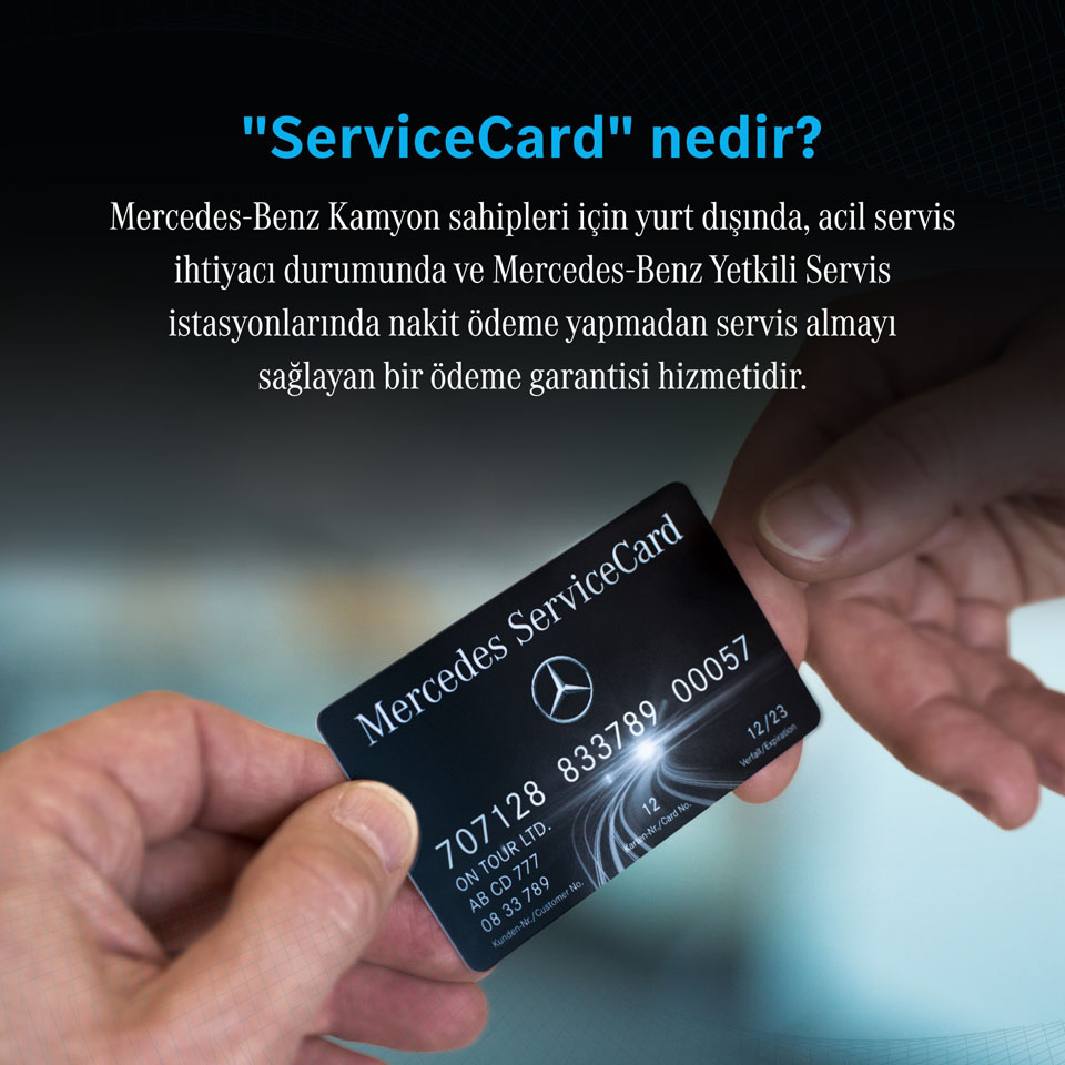Mercedes-Benz Türk, Mercedes Service Card hizmeti ile Mercedes-Benz kamyon sahiplerinin yanında olmaya devam ediyor. Araçları yurt dışında da çalışan Mercedes-Benz kamyon sahipleri Mercedes Service Card ile bulundukları ülkede acil teknik servise ihtiyaç duyduklarında nakit ödeme yapmadan Mercedes-Benz yetkili servis istasyonlarından hizmet alabiliyorlar. Bir ödeme garantisi hizmeti olan Mercedes Service Card, Avrupa’daki binlerce Mercedes-Benz yetkili servisinde kullanılabiliyor.