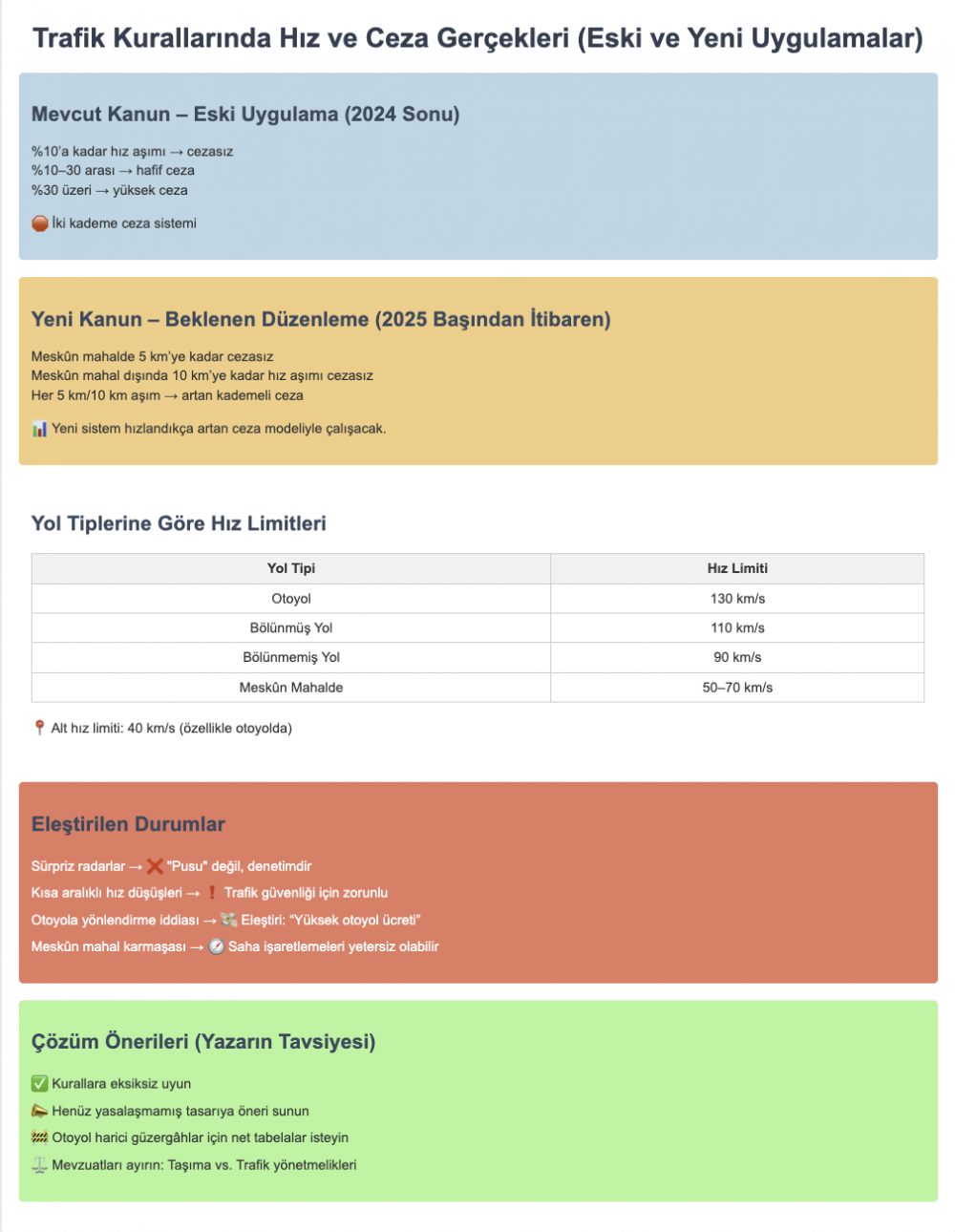 Mevcut düzenleme ve cezalardan şikâyet edenler yeni kanun ile artacak cezalara şimdiden hazırlansınlar. Kurtulmak için iki yol öneriyorum: Birincisi kurallara, özellikle de hız limitlerine tam uyacaklar. İkincisi de yasalaşmamış kanuna şimdiden gerekli düzeltme katkısını verecekler.