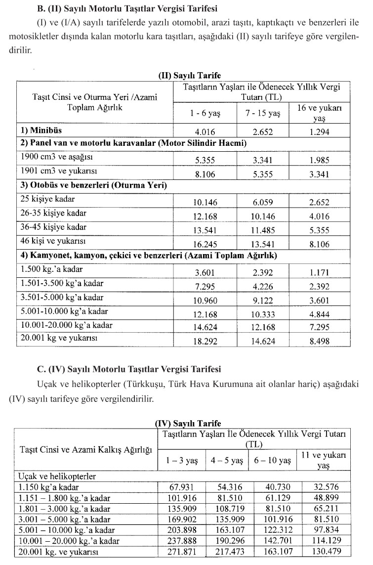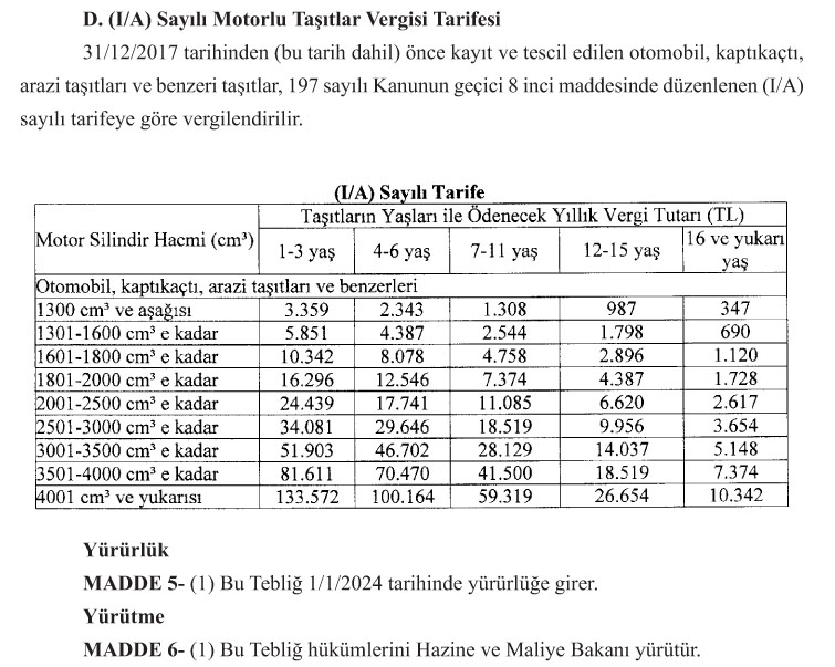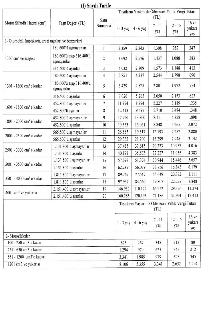Hazine ve Maliye Bakanlığı'na bağlı Gelir İdaresi Başkanlığı tarafından yapılan Motorlu Taşıtlar Vergisi Genel Tebliği'nde yer alan 2024 yılında ödenecek Motorlu Araç Vergisi (MTV) tarifesi şöyle: