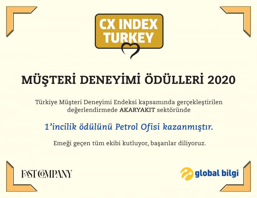 ‘Müşteri Deneyimi Endeksi’nde Petrol Ofisi, sunduğu müşteri memnuniyeti odaklı, kaliteli hizmet anlayışı ilelideri olduğu akaryakıt sektöründe katılımcılardan en yüksek puanı aldı. İletişim, Ürün/Hizmet, Kolaylık, Fedakarlık, Yanında Olma, Güven, Empati, Değer, İzlerin Deneyimi ve Tekrar Kullanım gibi 10 ayrı kriter üzerinden yapılan puanlamada Petrol Ofisi en yüksek puanı alarak, Müşteri Deneyimi Ödülleri ‘20 – CX Index Turkey’de akaryakıt sektörünün‘En İyi’ firması oldu.