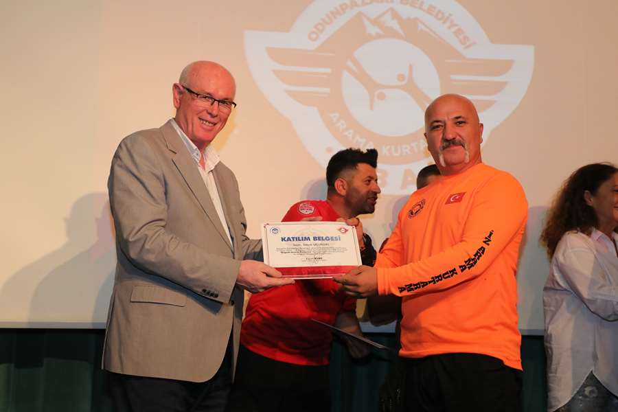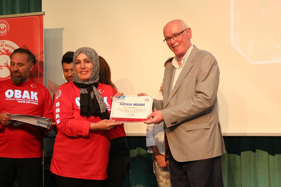 Konuşmaların ardından, katıldıkları orman yangınlarında gerçekleştirdikleri başarılı çalışmalardan dolayı teşekkür belgesi alan ve OBAK Eğitmenlik Eğitimini tamamlayan Odunpazarı Belediyesi belediye personeline; OBAK eğitmenleri tarafından düzenlenen