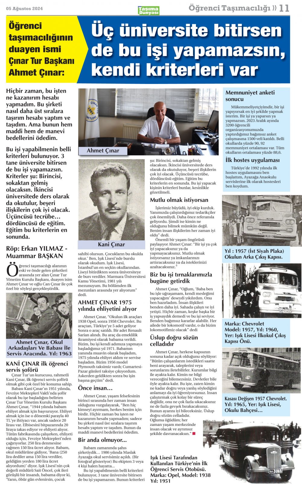 Ahmet Çınar, idari işleri oğlu Can Çınar’a devretmiş. Can Çınar, Işık Üniversitesi İngilizce işletme bölümünü bitirmiş ve bu işi severek yaptığını söylüyor: “Biz bu mesleği dedemizden devraldığımız için hem miras olarak görüyoruz hem de taşıma işinin önemini biliyoruz. Çocukları taşımak, ailelere de dokunmak gibi geliyor. Hizmet sektörü gibi değil, çözüm üreten bir konumdasınız. Ben iş halletmeyi seven biriyim. Bu mesleği severek, babamın hiçbir zorlaması olmadan, yapmak üzere tercih ettim. Dedem yaşarken de istiyordu, babam da istiyor.”