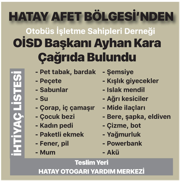 Deprem felaketinin ardından tüm üye otobüs firmalarının ihtiyaç listesine göre yardımlara başladığını belirten Otobüs İşletme Sahipleri Derneği (OİSD) Başkanı ve Has Turizm Yönetim Kurulu Başkanı Ayhan Kara, “Hassasiyetlerinden ve içtenliklerinden dolayı hemşehrilerim adına minnettarım. Sektörümüzün temsilcileriyle ve OİSD ile bir kez daha gurur duydum. Bu süreçte TOFED yönetimi de bizi hiçbir şekilde yalnız bırakmadı ve çok önemli bir dayanışma örneği sergilendi” dedi.