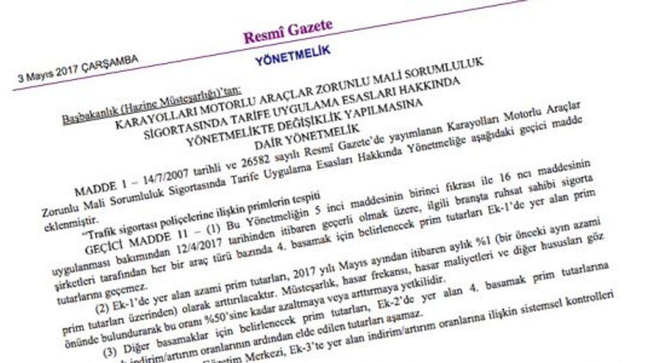 Hazine Müsteşarlığının "Karayolları Motorlu Araçlar Zorunlu Mali Sorumluluk Sigortasında Tarife Uygulama Esasları Hakkında Yönetmelikte Değişiklik Yapılmasına Dair Yönetmeliği" 3 Mayıs 2017 tarih ve 30055 sayılı Resmi Gazete’de yayınlandı.