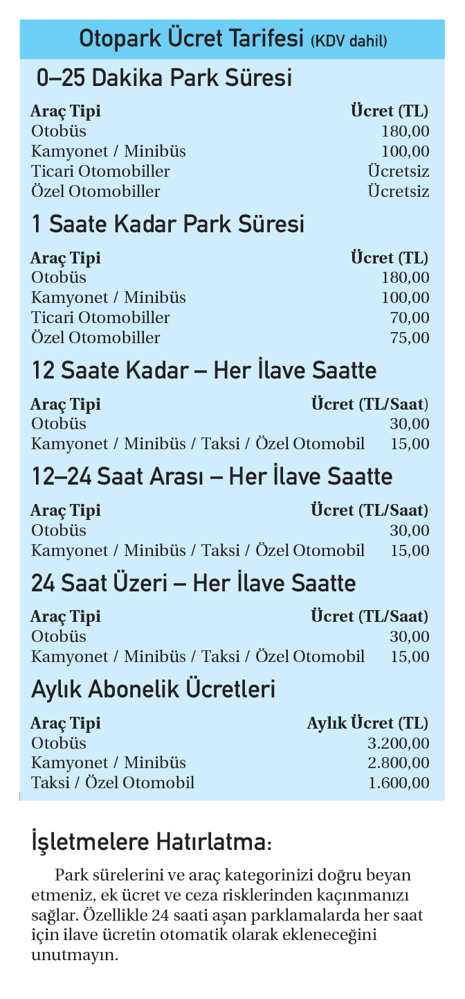 Otobüs, minibüs, kamyonet ve özel araçları kapsayan otogar otopark ücret tarifesi yenilendi. Yeni düzenlemeye göre, park süresi, araç tipi ve kullanım amacına göre ücretler farklılaşıyor. Özellikle otobüsler için saatlik ve aylık park ücretleri dikkat çekici seviyeye ulaştı. İşte otogar girişlerinde uygulanacak yeni parklanma tarifesi. ■