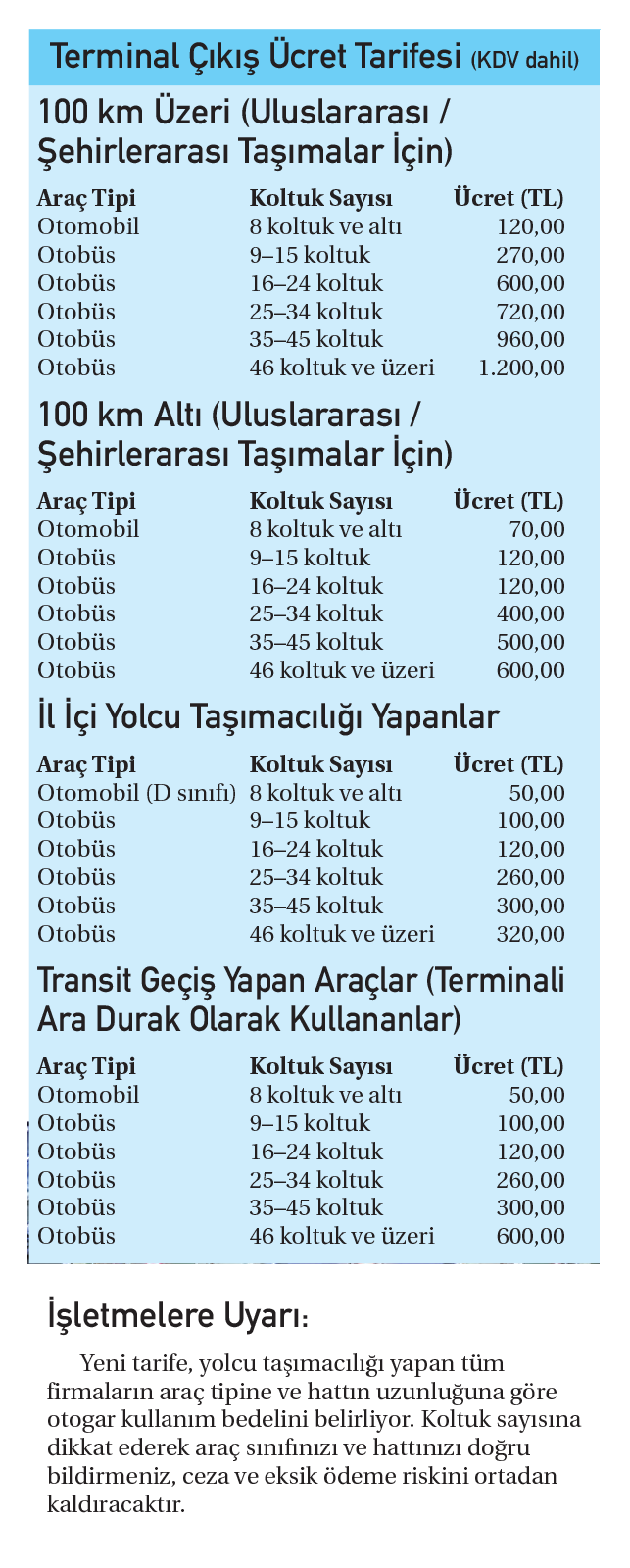 İstanbul Büyükşehir Belediyesi Lojistik Yönetimi Ve Terminaller Şube Müdürlüğü’nce otobüs işletmelerini yakından ilgilendiren otogar kullanım ücretlerine dair güncel tarife açıklandı. Yeni tarifeye göre; araçların koltuk sayılarına, taşıma mesafesine ve güzergâh türüne göre giriş-çıkış ücretleri yeniden düzenlendi. 2026 yılı itibarıyla uygulanacak ücretler, şehirlerarası (100 km üstü/altı), il içi ve transit geçiş yapan otobüsleri kapsıyor.