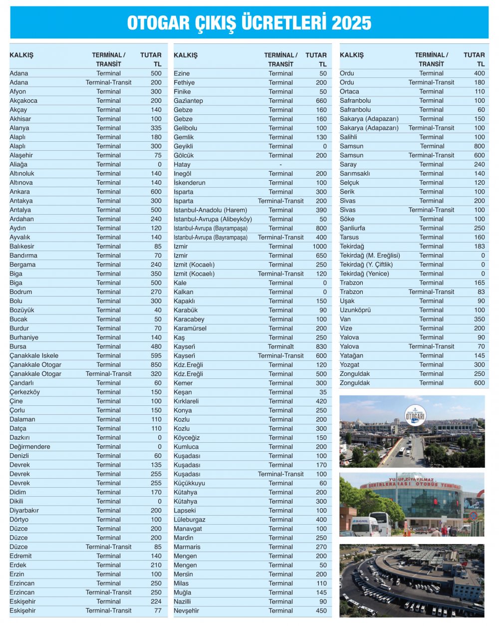 Karayolu yolcu taşımacılığı sektörünün önemli maliyet kalemlerinin başında otogar çıkış ücretleri geliyor. Her yıl başında diğer maliyet kalemlerinde olduğu gibi otogar çıkış ücretlerinde de artışlar yaşanıyor. TAŞIMA DÜNYASI olarak biz de otogar çıkış ücretlerine yönelik bir tablo oluşturmak istedik.
