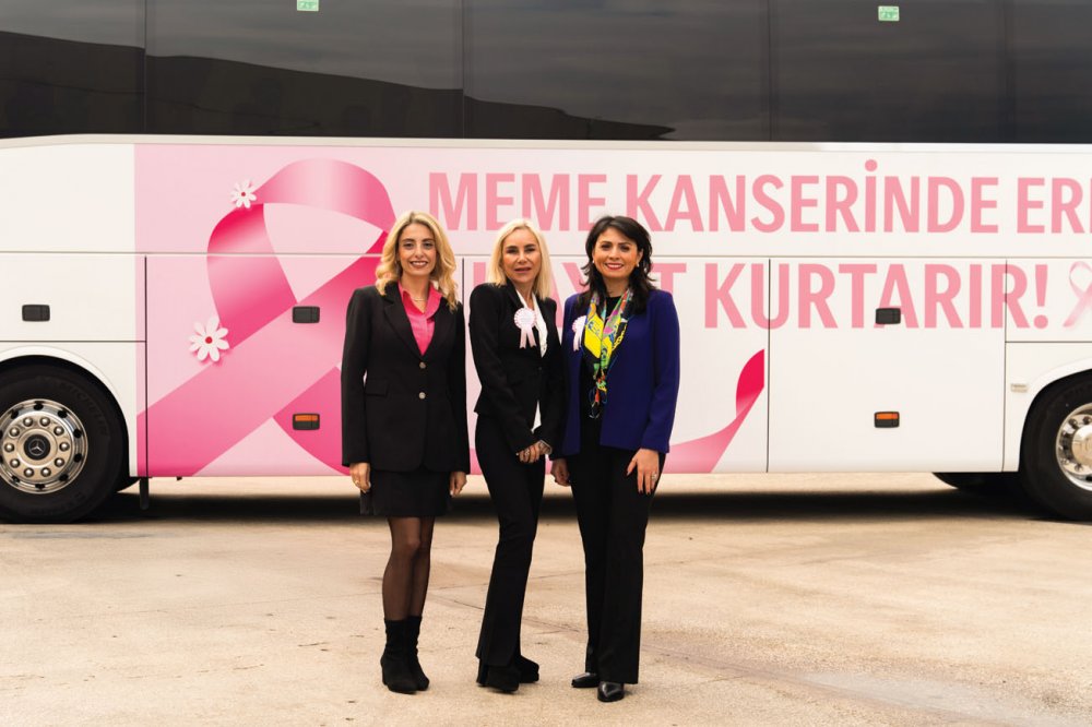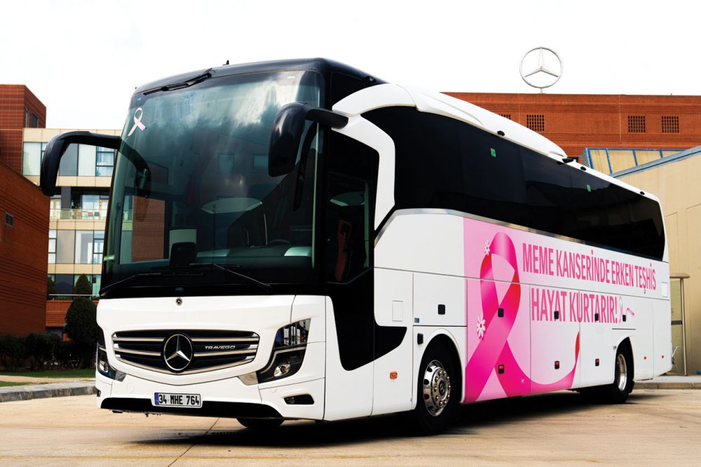 Bu yıl da bu farkındalığı, Mercedes-Benz Türk olarak eğitim otobüsümüzü projeye dahil ederek sürdürüyoruz. Mercedes-Benz Travego 16 eğitim otobüsümüzü hem “Meme Kanserinde Erken Teşhis Hayat Kurtarır” hem de “Meme Kanseriyle Mücadelede Yolumuz Bir” sloganlarıyla ve pembe renkli tasarımıyla giydirdik. Böylece eğitim otobüsümüz tüm Türkiye’de geçtiği yollarda ve eğitim için gittiği tüm lokasyonlarda bu farkındalığa dikkat çekmeyi sürdürecek.