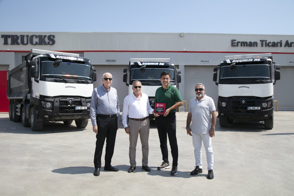 Mersin’de düzenlenen törende Özçiçek İnşaat Yönetim Kurulu Başkanı Menderes Çiçek’e araçları Renault Trucks Türkiye Ticari Direktörü Özgür Fırat, Filo Müşterilerinden Sorumlu Ülke Müdürü Cihat Kayan, Erman Ticari Araçlar Yönetim Kurulu Başkanı Mehmet Deniz, Genel Müdürü Ahmet Gözü ve Satış Müdürü Can Ariş tarafından teslim edildi.