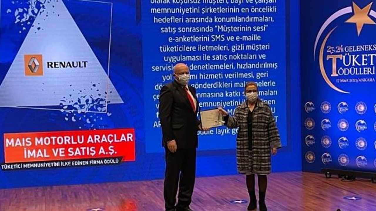 Ticaret Bakanlığı Tüketicinin Korunması ve Piyasa Gözetimi Genel Müdürlüğü tarafından düzenlenen Tüketici Ödülleri’nde tüketici memnuniyetini ilke edinen firmalar, tüketicileri koruyan kuruluşlar ve bilimsel çalışmalar ödüllendirildi. 17 Mart 2021 tarihinde Ticaret Bakanlığı tarafından düzenlenen 23’üncü ve 24’üncü Geleneksel Tüketici Ödülleri töreninde Renault MAİS Müşteri ve Şebeke Geliştirme Direktörü Hüseyin Yusufoğlu, “Tüketici Memnuniyetini İlke Edinen Firma” ödülünü Ticaret Bakanı Ruhsar Pekcan’ın elinden aldı.Renault MAİS bu sene otomotiv sektöründe ödül alan tek firma oldu.