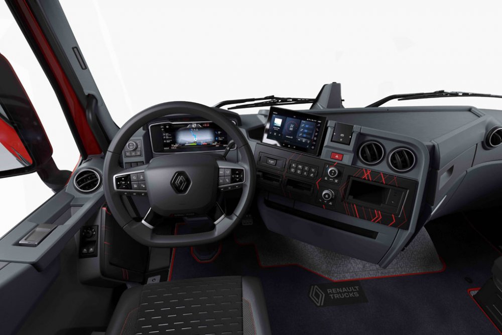 Optimum sürüş konforu için direksiyon deri ile kaplanabilirken, Renault Trucks T, T High, C ve K modellerinin koltukları kumaş ve/veya deri, klasik veya kompakt, kömür grisi veya siyah ile ön paneli ise kırmızı renkte özelleştirilebiliyor. Renault Trucks E-Tech T ve C elektrikli modelleri de belirgin bir mavi ve kırmızı renge sahip bulunuyor.