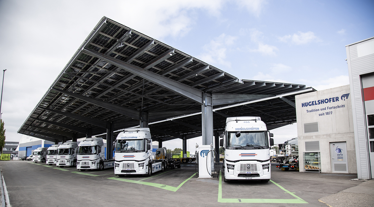 Hugelshofer’in Frauenfeld tesisinde yer alan 480 kW gücündeki 30 hızlı şarj istasyonu, günde 100 elektrikli kamyona hizmet verebiliyor. Şirket, şarj altyapısını 1,2 milyon kWh kapasiteli güneş enerjisi sistemi ve üç trafo ile destekliyor. Şarjların %95’i doğrudan tesiste yapılıyor.