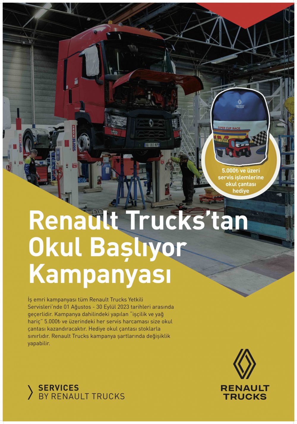 Renault Trucks, kullanıcılarının okul çağındaki aile bireylerini mutlu etmek için yeni bir kampanya başlattı. Tüm Renault Trucks Yetkili Servisleri’nde 01 Ağustos - 30 Eylül 2023 tarihleri arasında geçerli olacak kampanya dahilinde yapılan “işçilik ve yağ hariç” 5.000 TL ve üzerindeki her servis harcaması, okul çantası kazandırıyor.