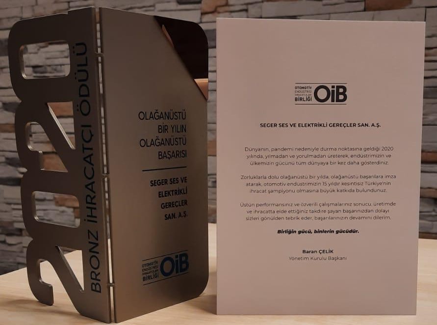 2020 yılında da şampiyon olunmasına özverili çalışmaları ile katkıda bulunan Seger’e Türkiye otomotiv endüstrisinin ihracattaki tek koordinatör birliği olan Uludağ Otomotiv Endüstrisi İhracatçıları Birliği (OİB) tarafından ‘Bronz İhracatçı Ödülü’ verildi. Seger’in de aralarında bulunduğu başarılı üretici ve ihracatçı firmalar, her anlamda zorlayıcı pandemi koşulları nedeniyle dünyanın durma noktasına geldiği 2020 yılında faaliyetlerine devam ederek Türkiye’nin otomotiv endüstrisindeki kesintisiz 15 yıllık şampiyonluğuna katkı sağladı.