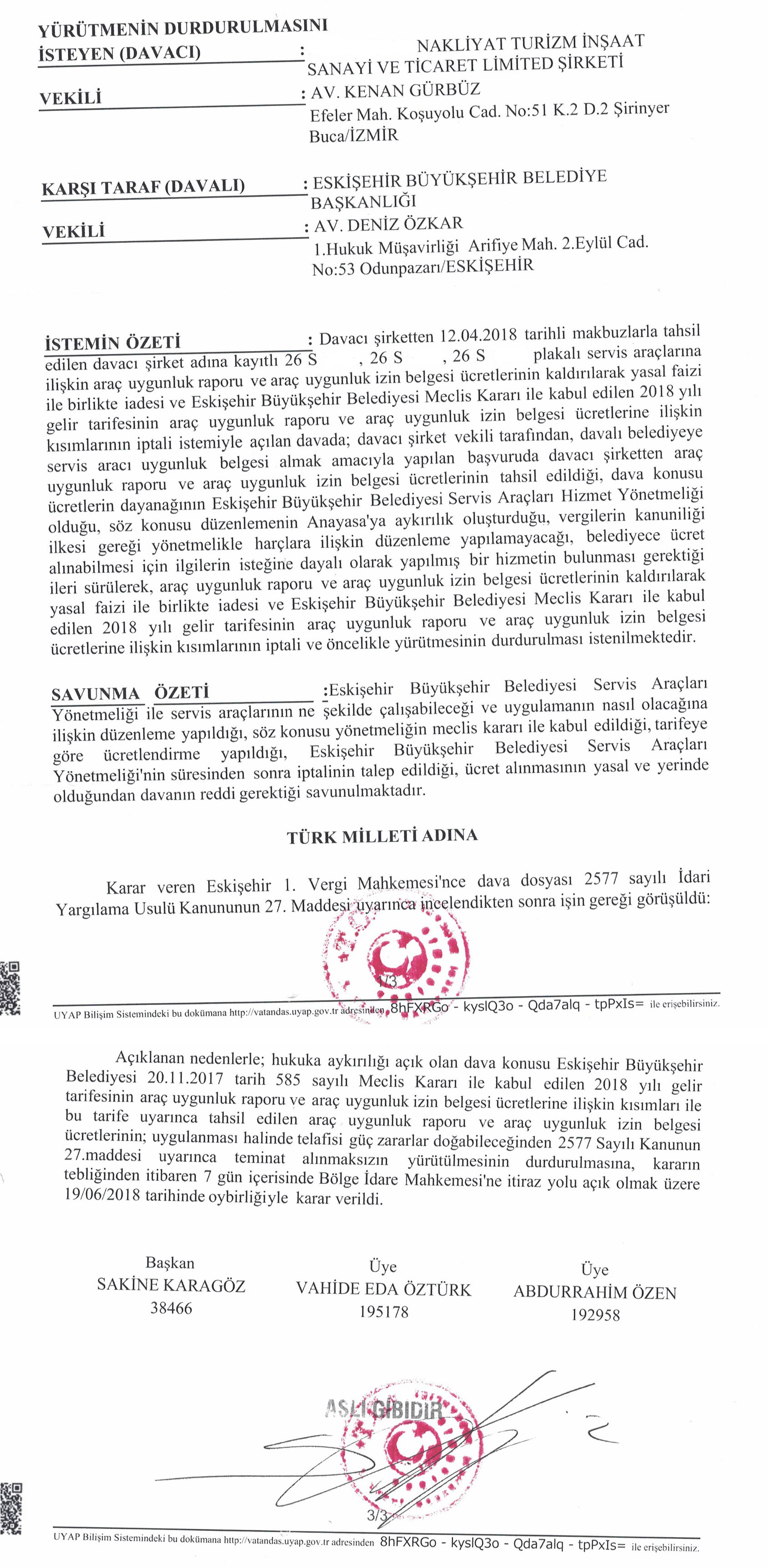 Açılan davada Eskişehir 1. Vergi Mahkemesi yürütmenin durdurulmasına karar verildi. Mahkeme kararında;  “Anayasa’nın 73’üncü maddesi hükmü uyarınca yönetmelik ile harç düzenlemesi yapılmasının hukuken mümkün olmadığı vurgulandı. Anayasa’nın “Vergi Ödevi” başlıklı 73’üncü maddesinin 3’üncü fıkrasında; vergi, resim, harç ve benzeri mali yükümlülüklerin kanunla koyulacağı, değiştirileceği veya kaldırılacağı hüküm altına alınmıştır. 2464 sayılı Belediye Gelirleri Kanunu’nun 97’inci maddesinde; “BelediyelerbuKanundaharçveyakatılmapayıkonusuyapılmayanveilgililerinisteğinebağlıolarakifaedecekleri her türlü hizmeti için belediye meclislerince düzenlenecek tarifelere göre ücret almaya yetkilidir. Belediyeye tekel olarak verilmiş işler kendi özel hükümlerine tabidir.” Düzenlemesine yer verilmiştir. Bu bakımdan, belediye idareleri tarafından 2464 sayılı Belediye Gelirleri Kanunu uyarınca gelir tarifelerinde düzenleme yapılırken Anayasanın 73’üncü maddesinde hüküm altına alınan vergide kanunilik ilkesine riayet edilmesi gerekmekte olup, yönetmelik veya yönerge ile mali yükümlülük ihdas edilmesi ve ayrıca belediyelerin asli ve zorunlu görevleri arasında sayılan hususlara ilişkin olarak ücret tahakkuku yapılması hukuk en mümkün değildir” denildi.