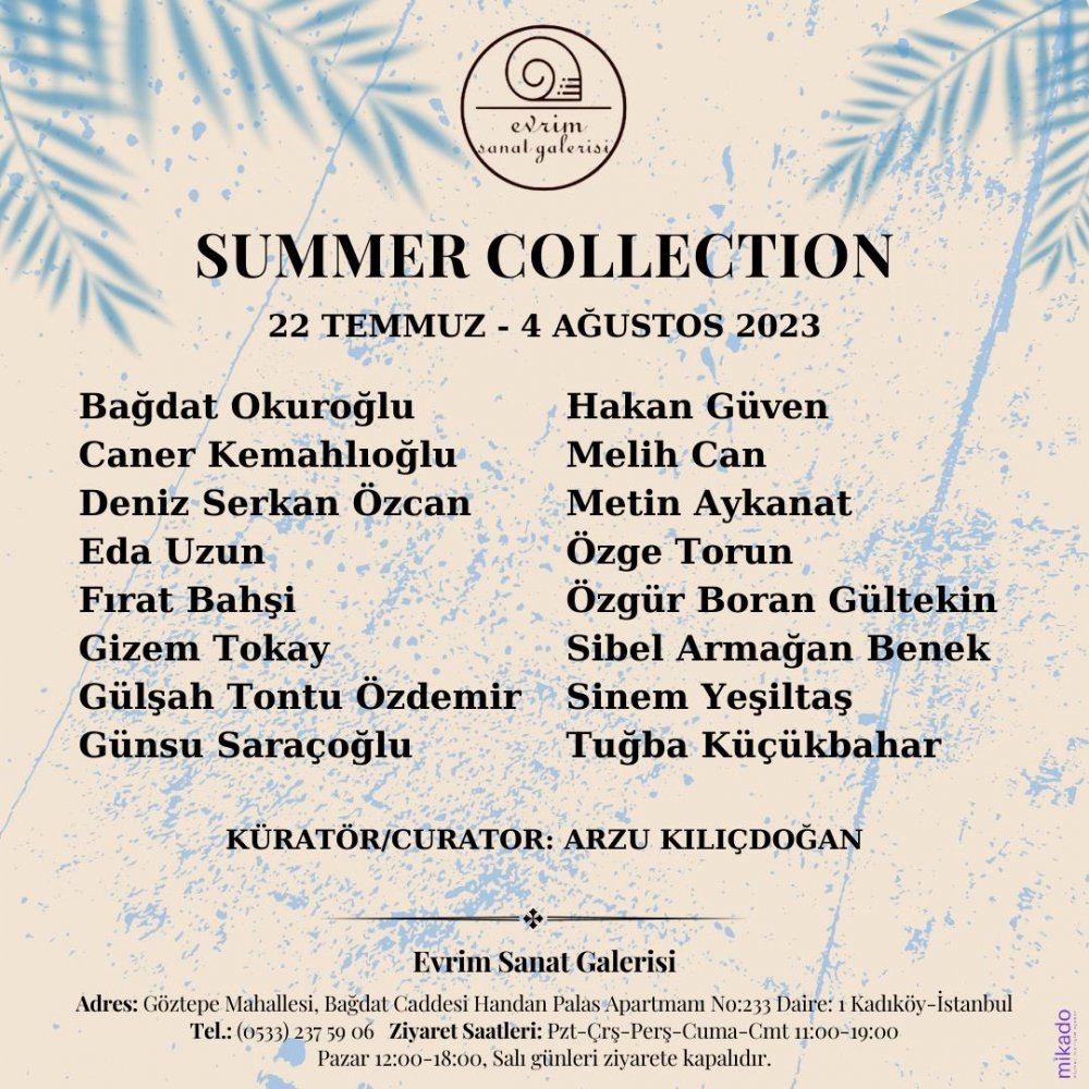 Serginin küratörlüğünü yürüten Arzu Kılıçdoğan sergi hakkındaki düşüncelerini şu sözleriyle ifade etti:“Evrim Sanat Galerisi, keyifli ve başarılı sergi seçkilerine, “Summer Collection” sergisiyle ev sahipliği yapmaya devam ediyor. Bu sergi ile Evrim Sanat Galerisi, genç sanatçılara desteğini sürdürüyor. Sanatçının farklı tekniklerle hazırlanmış seçkisini sanatseverler ile buluşturmaktan dolayı mutluluk duyuyoruz. Evrim Sanat Galerisi’ne tüm sanatseverleri bekliyoruz.”