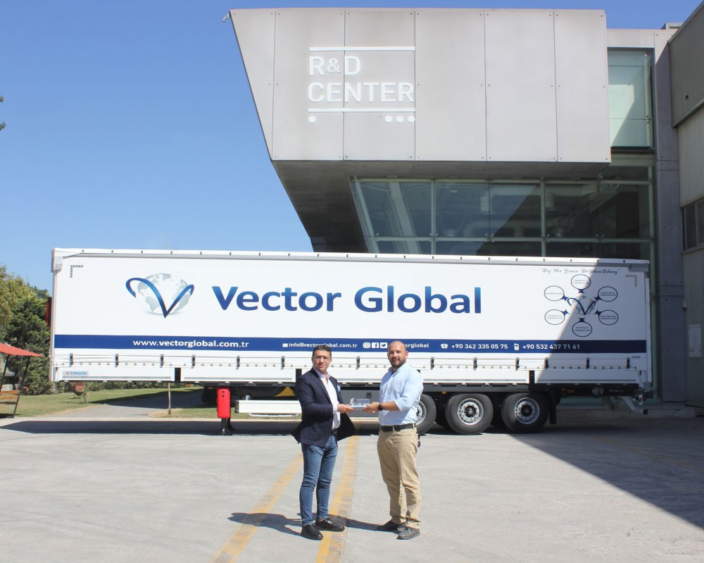 Tırsan SCS X+’lerin teslimat törenine Vector Global Lojistik Yönetim Kurulu Başkanı Yunus Başkara ve Tırsan Treyler Satış Yöneticisi Orkun Demir katılım gösterdi.