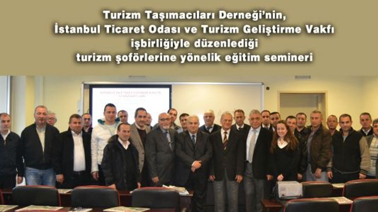 Turizm Taşımacıları Derneği’nin, İstanbul Ticaret Odası ve Turizm Geliştirme Vakfı işbirliğiyle düzenlediği turizm şoförlerine yönelik eğitim seminerlerinin ilk bölümü yapıldı. Otobüs İşletmeciliği Mesleki Gelişim Eğitim Programı çerçevesi altında yapılan seminerler, 10-12 Aralık 2014 tarihleri arasında İstanbul Ticaret Üniversitesi Eminönü Yerleşkesi’nde düzenlendi.