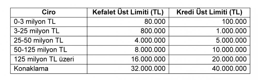 T.C. Hazine ve Maliye Bakanlığı garantisi ve Kredi Garanti Fonu kefaletii le bankalar* tarafından 10 milyar TL kredi sağlanacaktır. Krediler,01 Kasım 2021 tarihini aşmamak kaydıyla, azami 12 ay ödemesiz dönem olmak üzere 48 ay vadeli olacaktır. Yararlanıcı başına kefalet üst limiti 32 milyonTL ve kredi üst limiti 40 milyon TL olacaktırKredi ve kefalet limitleri ciro aralıklarına göre aşağıdaki şekilde belirlenmiştir: *Bu krediler aşağıda belirlenmiş bankalar aracılığıyla kullandırılabilecektir.