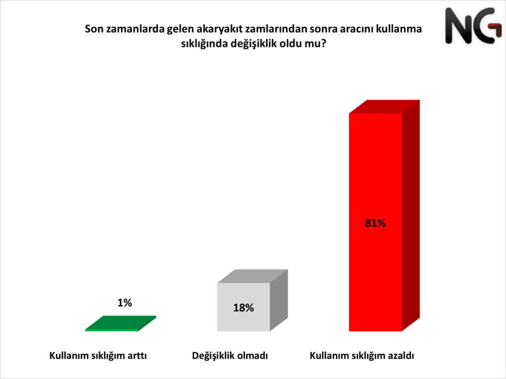 Arabası olan her 10 kişiden 8’i son zamlardan sonra araç kullanım sıklığını azalttığını belirtti. Arabası olmayan kişilere ise araba almama sebebini sorduğumuzda gelen yanıtlar yine ekonomik sorunları işaret ediyor. Katılımcıların %41’i kişisel ekonomik durumunun kötü olmasını sebep gösterirken, %39’u ise araba fiyatlarının çok yüksek olmasından kaynaklandığını belirtti.